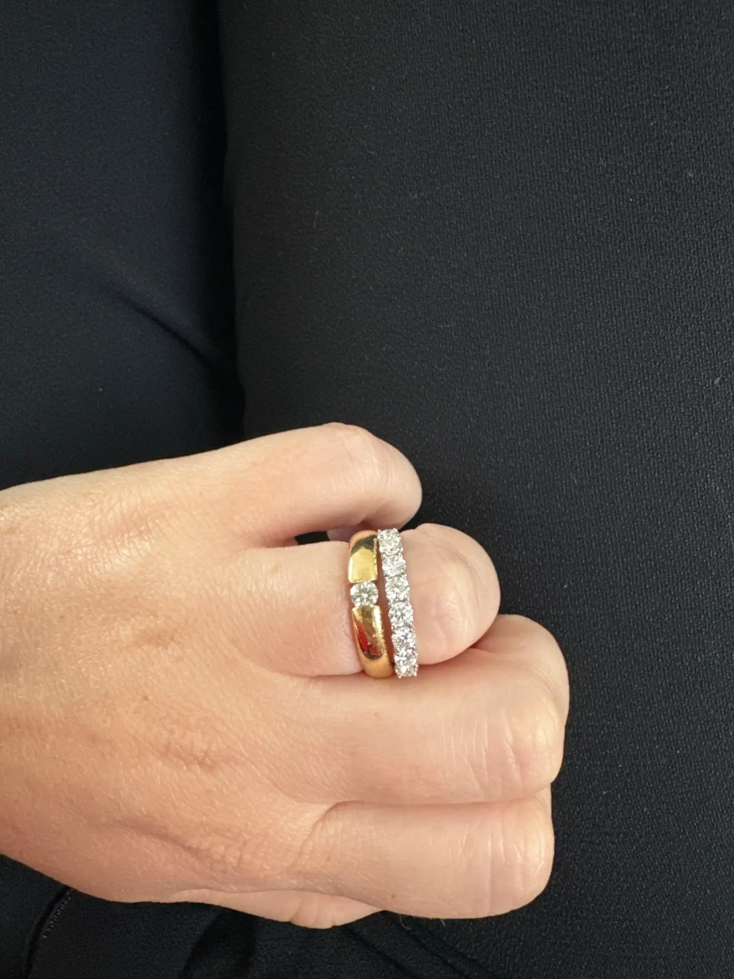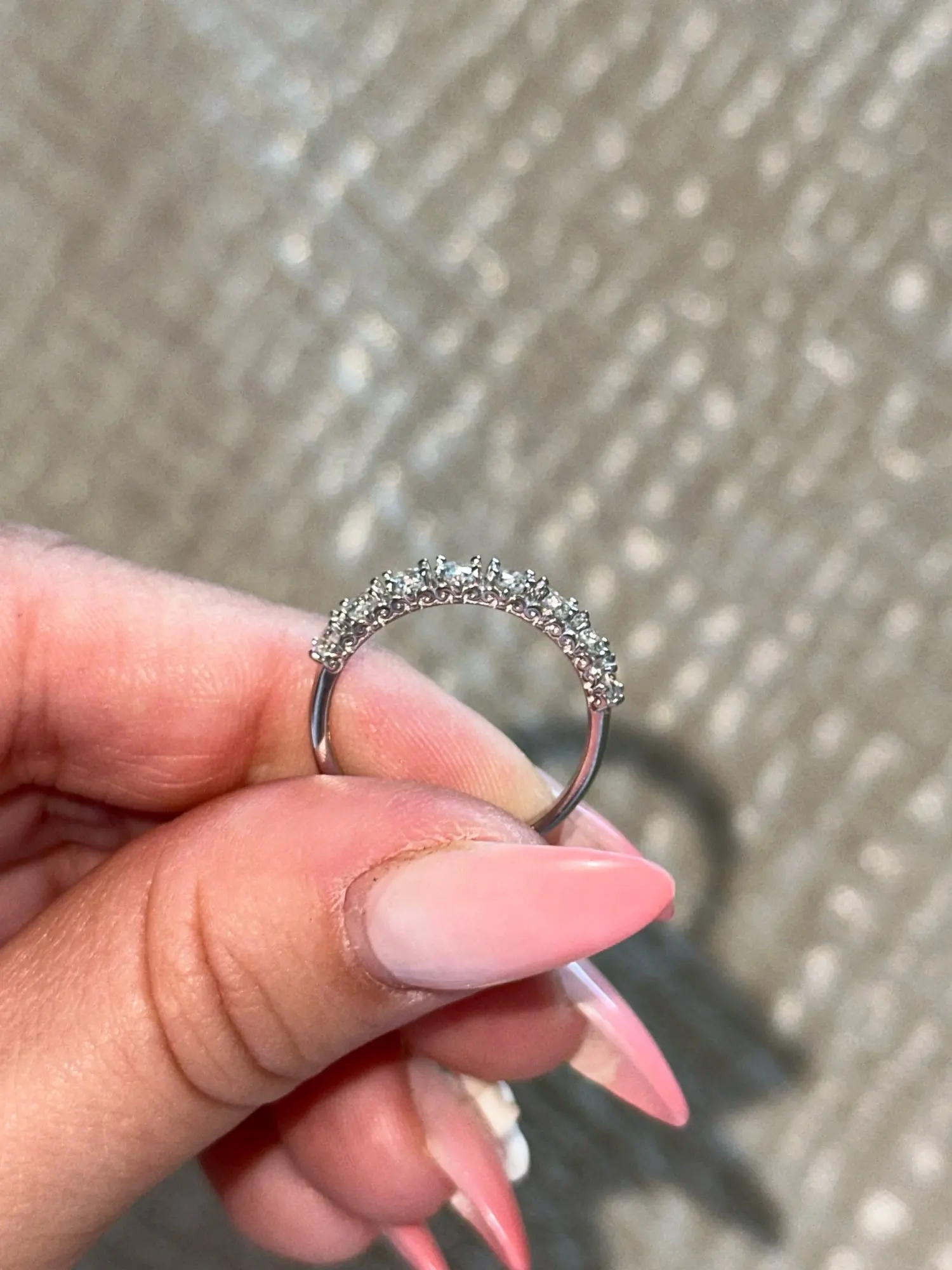Description: The simple pattern ring with 0.1 carats of Moissanite inlaid in the ring row. Each Moissanite will bring you lasting shine.