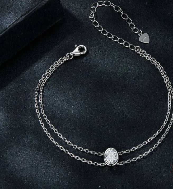 This oval-shaped 925 sterling silver bracelet features a double-layer design and showcases a sparkling 1CT moissanite gemstone. Crafted with quality materials, this bracelet exudes elegance and sophistication. Elevate any outfit with this stunning accessory.