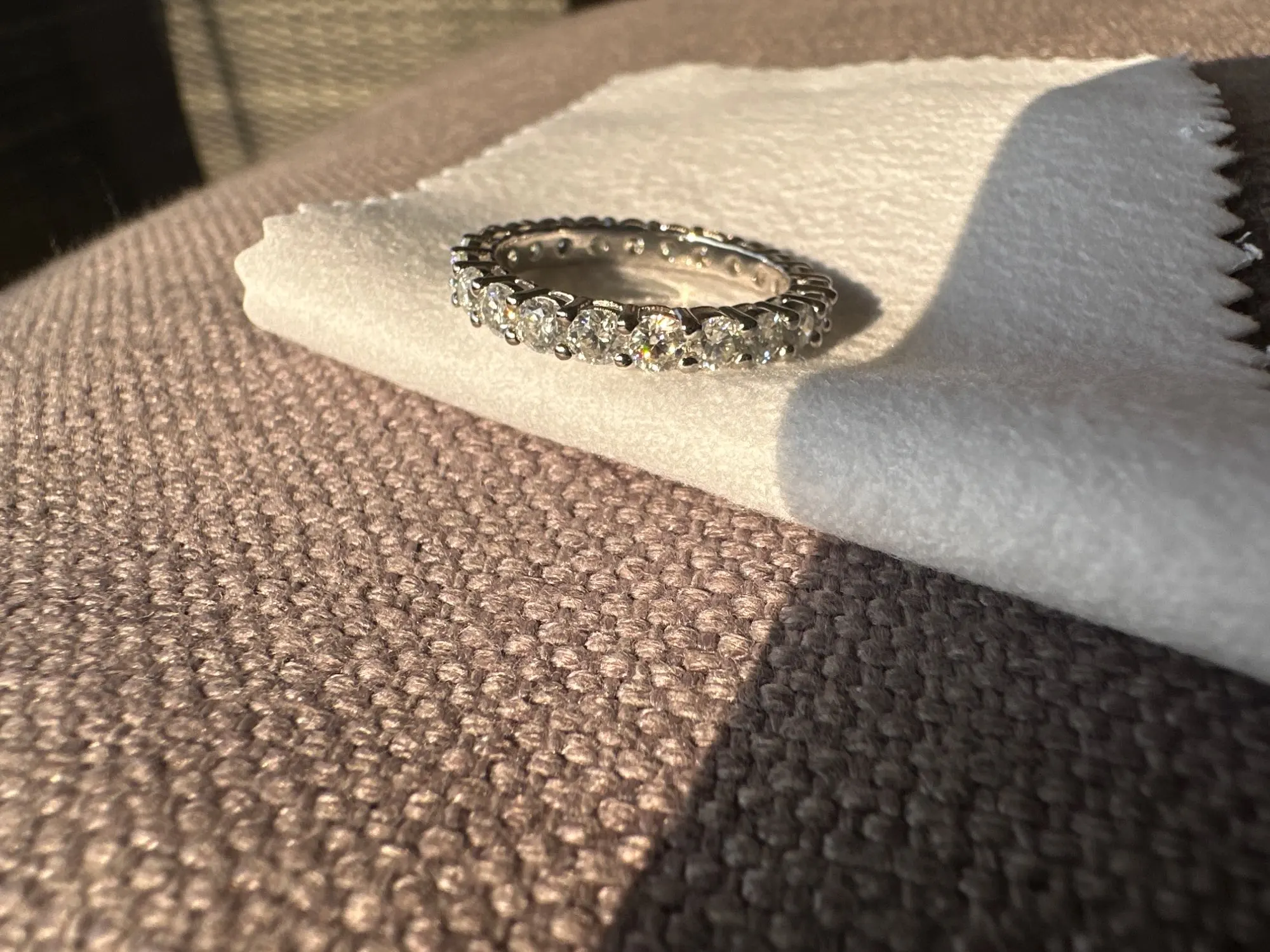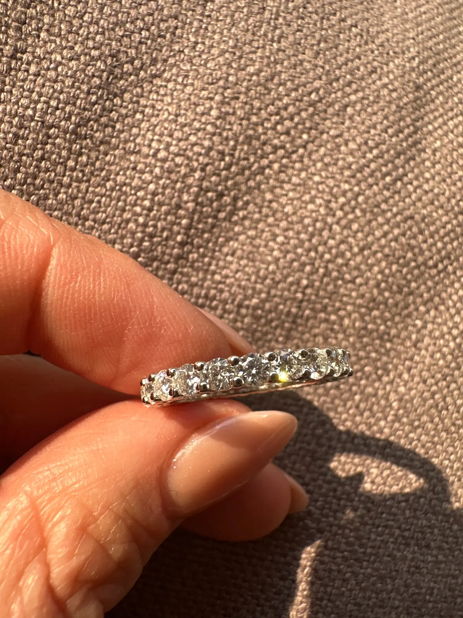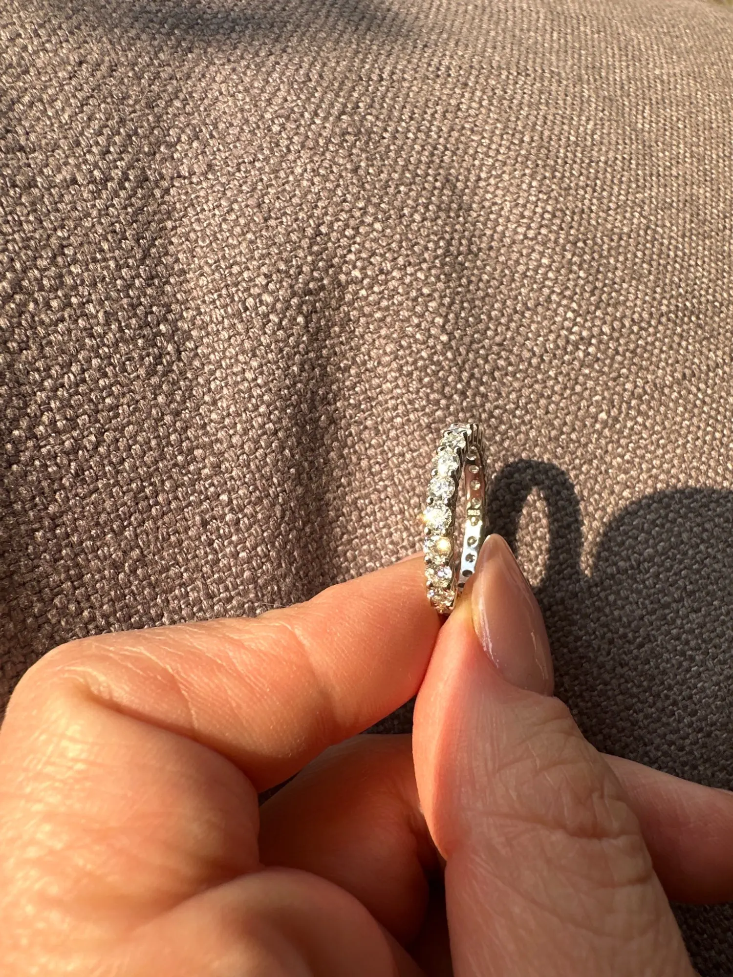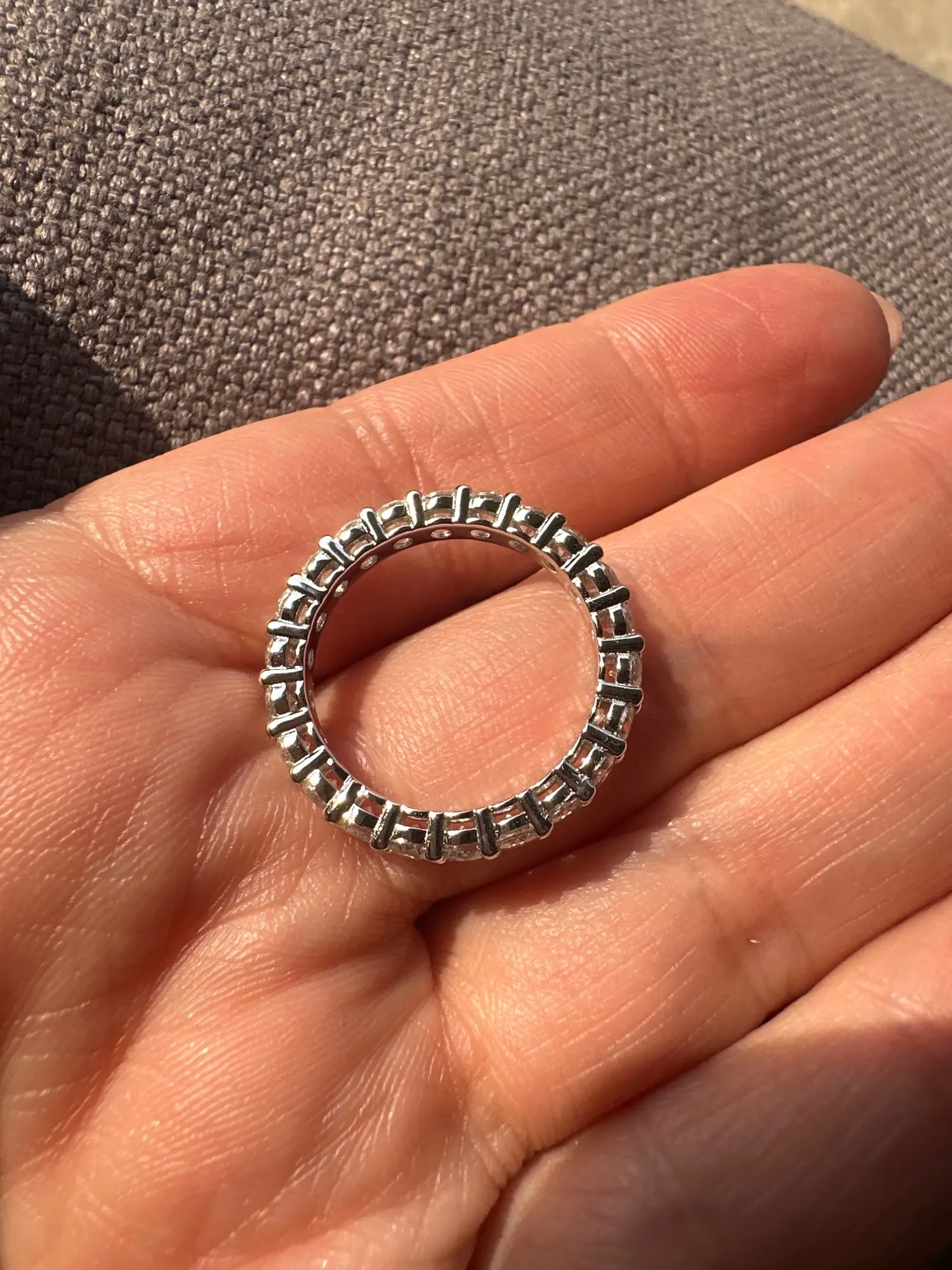 Description: The simple pattern ring with 0.1 carats of Moissanite inlaid in the ring row. Each Moissanite will bring you lasting shine.
